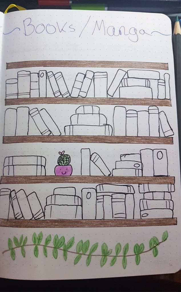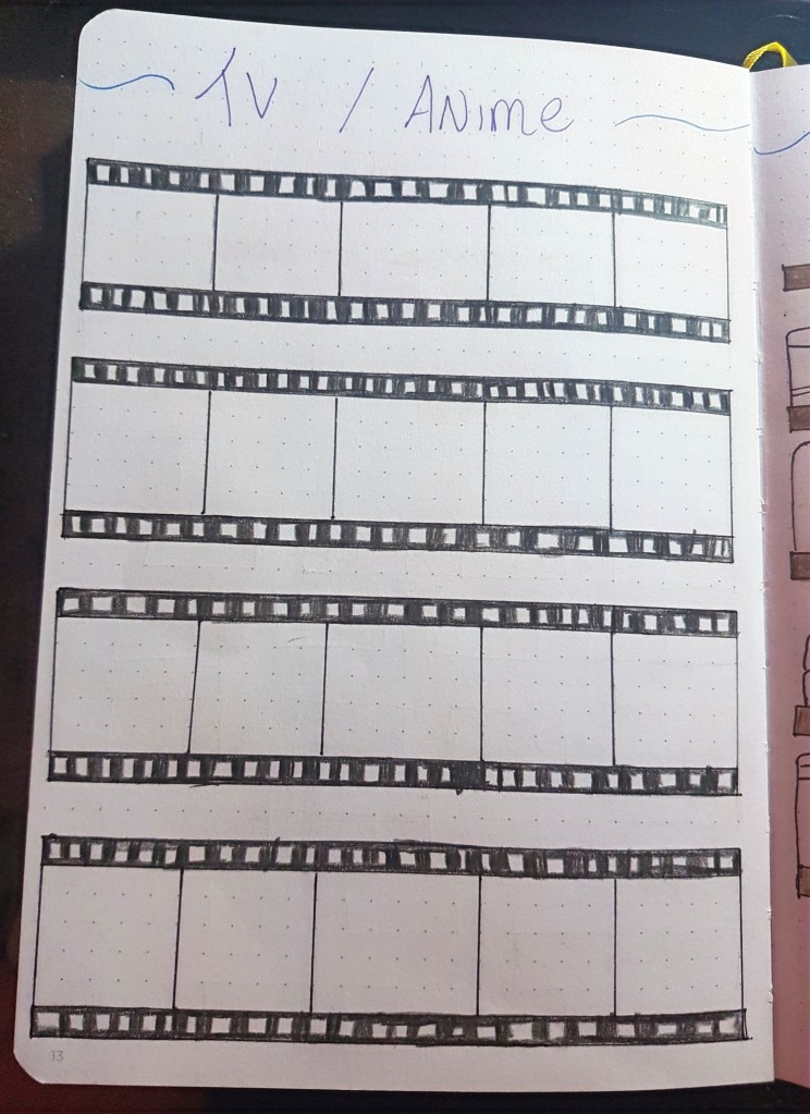 One of my favourite to draw – the Tv and Books trackers (Or the Anime and Manga if you’re like me!) There are some awesome design ideas for these sort of pages all over the internet. I got most of my inspiration from Pinterest. I plan to name and colour each book outline for any Manga or Book I read next year!^^