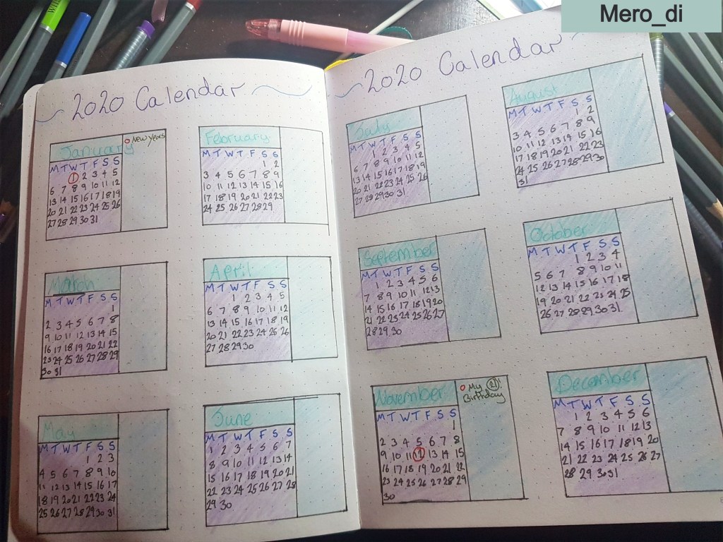 Straight after my intro page, I use a double page to design a calendar. I created the little note section beside each month so that I could mark out important dates with a circle or another shape, and make a note of it next to the month