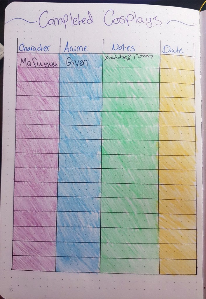 So these two pages are something I came up for myself. I want to make a list and keep track of the cosplays I complete and any songs I release throughout the year! My original idea for the cosplay tracker was far too complicated for me to try and draw^^; I wanted to draw a load of mini wigs and then name them and colour one in for each cosplay I do. But sadly, just trying to draw all of that out would take me hours;-; I used the same sort of Idea for the music, but that was a lot simpler to draw!