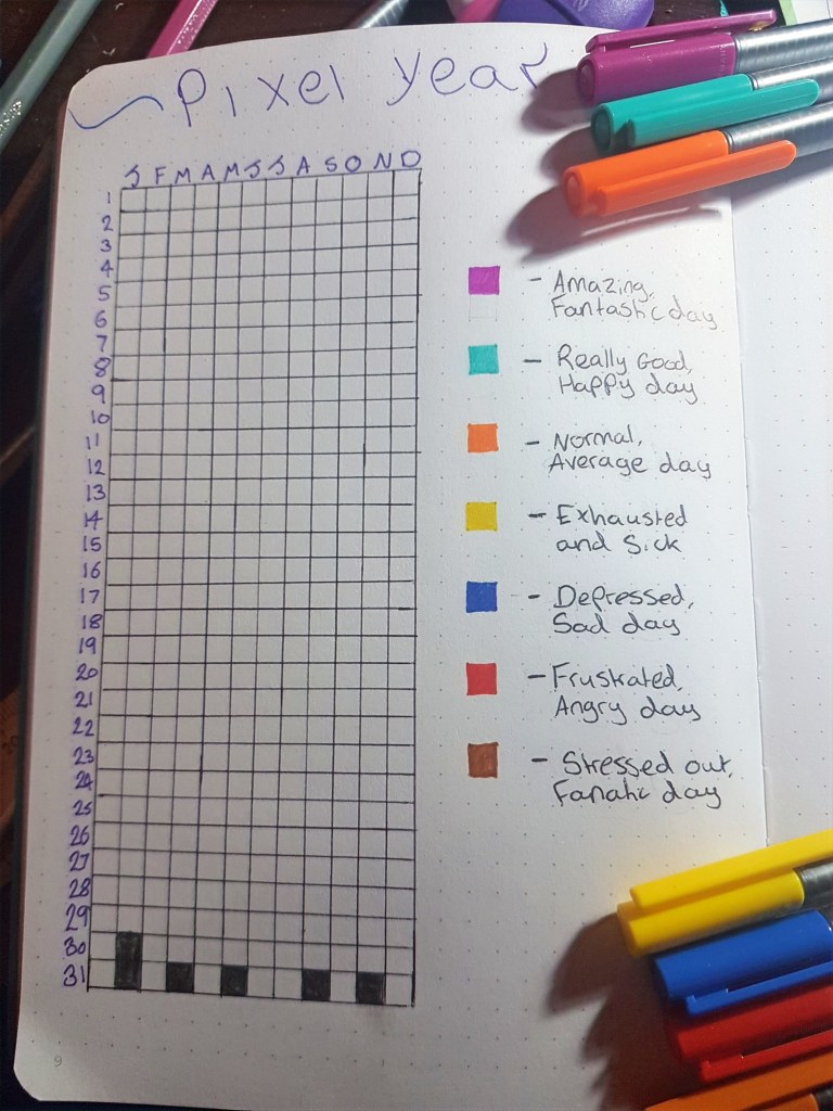 A pixel year is usually drawn out as a chart, but I have seen some really cool designs! – Some people do a monthly or weekly version. One of my favourite designs has to be colouring in a cactus each day of the week for your mood. I chose the much simpler design for the year though.