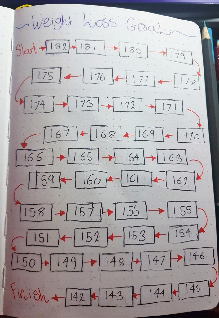 Another simple yet efficient idea is a weight loss tracker. It works in the same way as the savings, you colour in each section when you hit each goal! There’s really not a lot else to say about these pages^^;