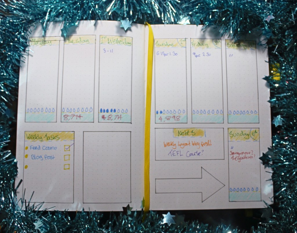 As you can see I have also drawn out 8 little water droplets for each day, that’s to try and help me drink more water. and the numbers beneath that are to note down how many steps i did each day!