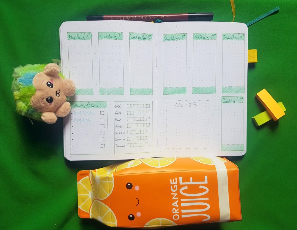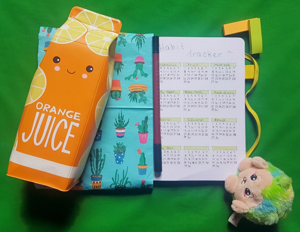 As you can see, I’ve completely changed my habit tracker style. The grid-style I used previously always ends up feeling a little too cluttered for my liking, It also seemed too big. I end up wanting to fill the page but not having enough habits to do so and then I can’t keep up with everything half as much because there’s just too much there! So this month I’m trying a much smaller and simpler style. I’m hoping that this will make it easier to keep on top of all the important things!^^