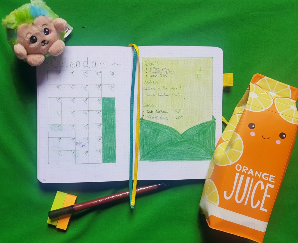 Straight away I’m sure you can guess my colour scheme for this month – Green!^^ I wanted something summery again but I also didn’t want to use yellows or oranges, so the colour of freshly cut grass seemed like the next best option!Other than the ongoing lock-down, there’s not a lot else happening this month except for my dads birthday and Fathers day being right next to each other T^T