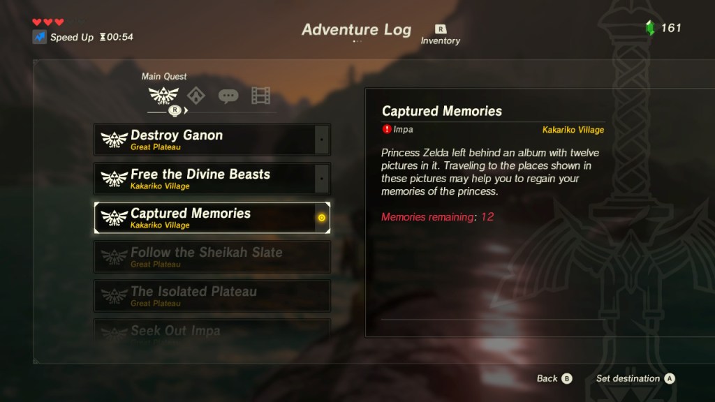 Once I’d regained my first memory I headed back to Kakariko village to visit the little old lady Impa where she gave me a reward – an old item of Links and then sent me away to find the rest (and with an abundance of other objectives too!)