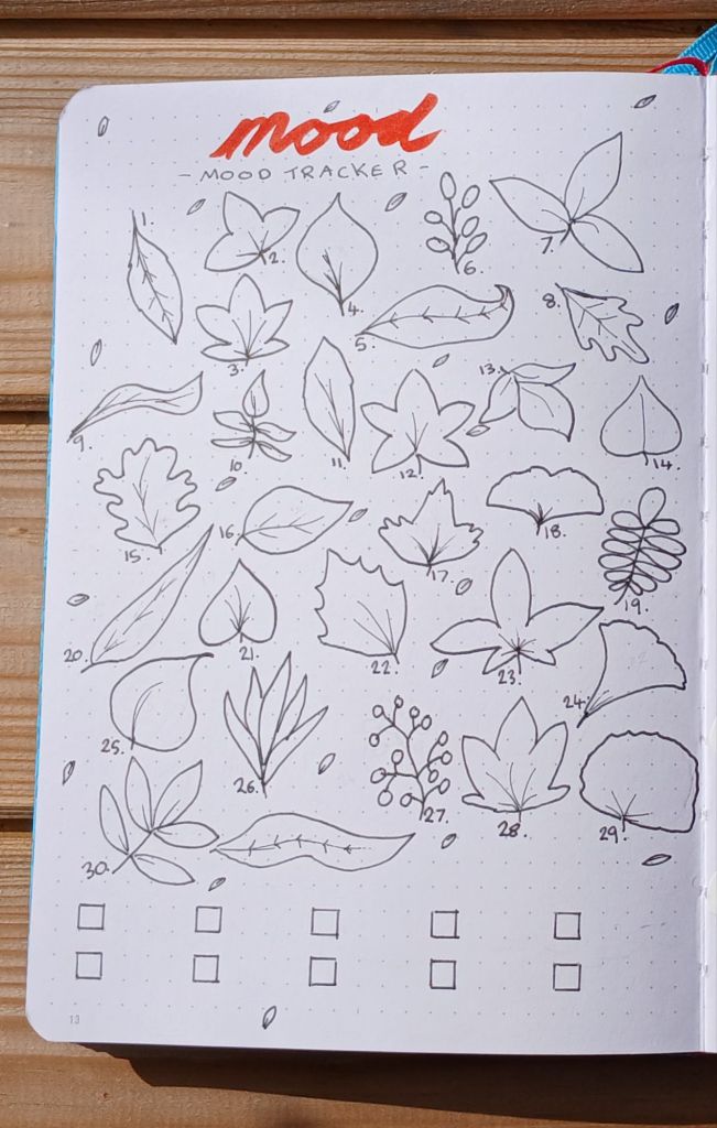 Since October is always reserved for a spooky theme, September gets the fallen leaves. I love the autumn aesthetic. The auburn colours and crunchy leaves that can also be nice and easy to doodle!