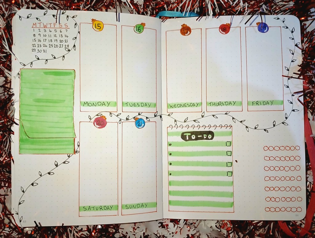 Because of Uni work, I’ve been behind on my Bullet Journal for a few weeks, so I didn’t have as much time to spend on it. I initially wanted to draw a more detailed tree, but then came across a design similar to this on Pinterest that I found inspiring. With the added snowflakes and holly, I think it works quite well!