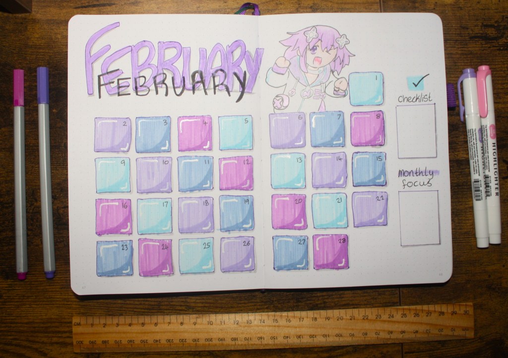 It’s a little late, but February is here! Last month, I found myself playing a lot of the game HyperDimension Neptunia Re;Birth 1, and so, when it came to drawing out this month, I seem to have subconsciously used Neptune’s colour theme.